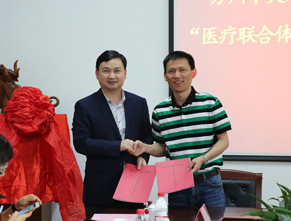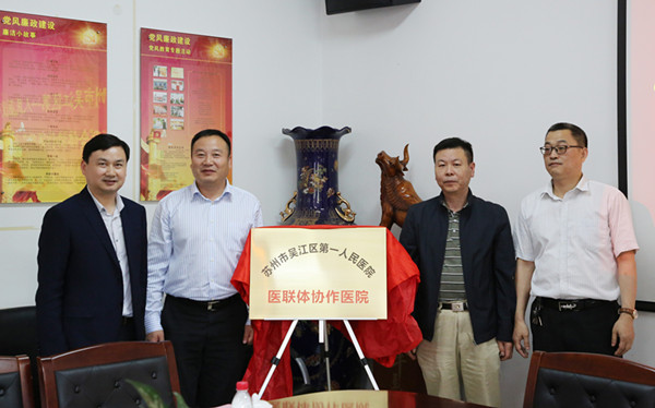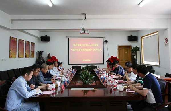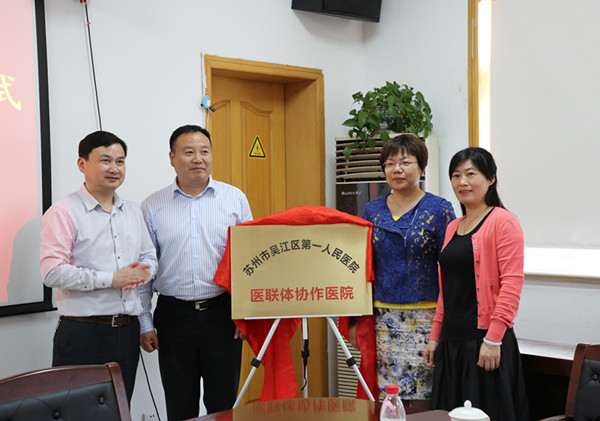 为深入贯彻落实国家医药卫生体制改革精神,按照吴江区卫计委《吴江区紧密型医联体建设方案》的要求,提高医疗资源的总体配置效率,提升基层医疗机构的诊疗水平,逐步实现分级诊疗的目标,5月8日,吴江区一院举行与松陵卫生院、同里卫生院、屯村卫生院、菀坪卫生院、横扇卫生院建立“医疗联合体协作医院”揭牌仪式。吴江区卫计委党委书记、主任沈宇,副主任孙建民,医政科科长薛建英,吴江区太湖新城社会事业局局长曹吉华,副局长朱林芳,吴江经济技术开发区社会事业局副局长胡卫娟,吴江区一院党委书记、院长沈根海,副院长张晓剑以及上述卫生院院长郑红根、赵伟红、沈付祥、吴建林、陈国平等参加仪式。揭牌仪式由区一院张晓剑副院长主持。