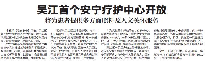 另外,记者还获悉,至2020年,吴江安宁疗护病房还将逐步向有条件的二级、一级医疗机构延伸。