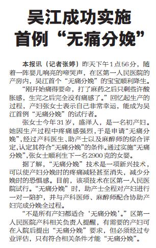 《吴江日报》:吴江成功实施 首例“无痛分娩”