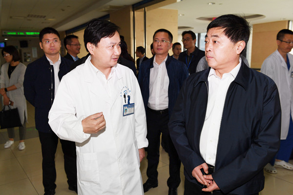 我院作为此次调研的一个环节,王庆华书记实地走访了急诊、门诊等地,感受就医环境,听取我院人才结构、科室建设以及医联体等方面情况汇报,对我院在创新服务流程、改善患者就医体验、打造五大中心等方面许多先行先试的做法表示赞赏。