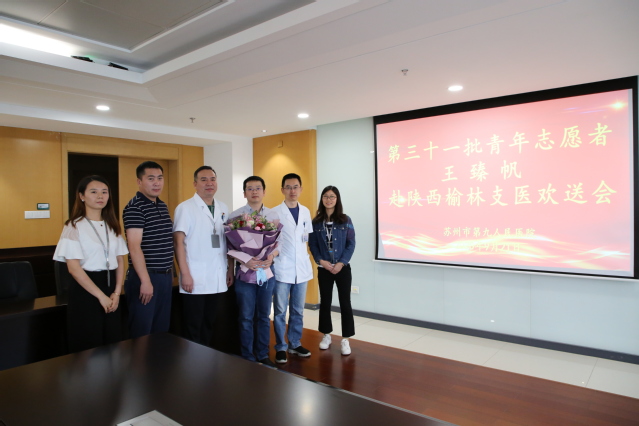 9月21日,亚洲色吧 泌尿外科王臻帆接过了对口支援的接力棒,作为苏州市第三十一批援陕扶贫支医青年志愿者奔赴陕西榆林,进行为期3个月的援陕医疗服务。当日上午,亚洲色吧 为王臻帆医生举办欢送仪式,副院长郎建华出席,医务处、团委、泌尿外科相关人员共同欢送。