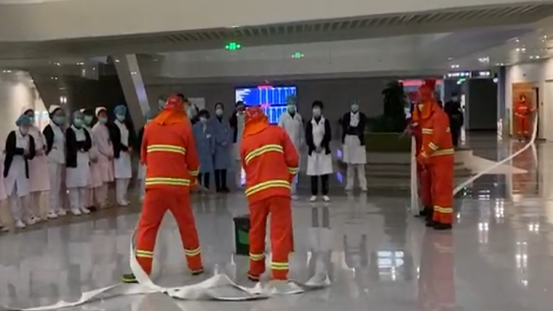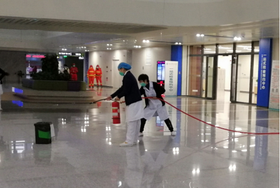 演练现场,门诊大厅模拟发生火灾,医务人员发现后迅速按下火警手报,并在火灾的初起阶段采取积极的灭火行动。消控室当班人员接到火警报告后,立刻组织安保人员和医院微型消防站人员,赶赴火灾现场参与救援,两队人马合力扑灭现场“大火”。