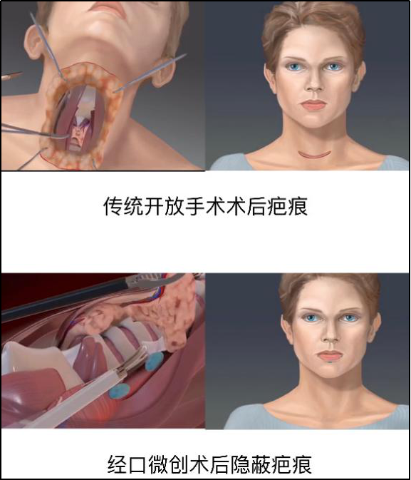 全腔镜下经口腔前庭入路联合刻下甲状腺切除手术不仅操作路径更短,所需操作空间更小,配合内镜下的放大视野,通过无血管解剖间隙进行分离,更能对重要的组织结构加以保护,符合现代微创外科的理念,是更微创的治疗,特别是对于有美容要求的患者来说,是福音。