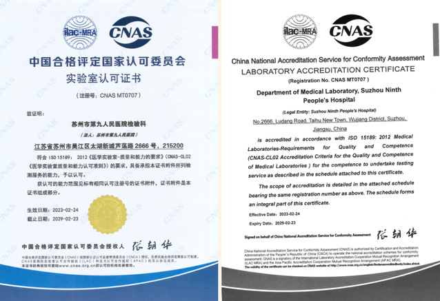 检验科获得中国合格评定国家认可委员会(CNAS)医学实验室认可证书,是吴江首家获得CNAS认可的三级综合医院的医学实验室。