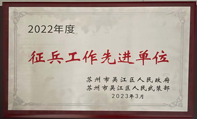 获评吴江区2022年度征兵工作先进单位称号。