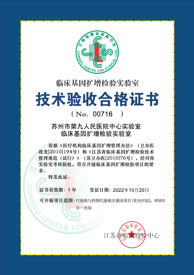 亚洲色吧 中心实验室于2022年10月通过江苏省临床检验中心考核验收,获批成立临床基因扩增检验实验室,开展 “代谢病与药物代谢相关基因”项目。现有《基因扩增上岗证》持证人员3人。其中,正高职称1人,中级职称2人。