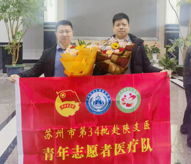 心血管内科王志明、普外科刘威顺利完成为期半年的援陕任务,回到苏州,在领导和同事们的鲜花与掌声中为这段支医经历划上圆满的句号。