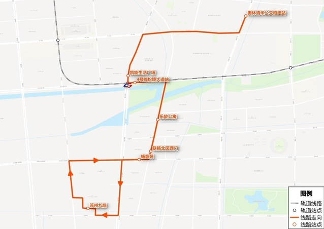 奥林清华公交枢纽站、鲈乡南路、开平路、松陵大道、东太湖大道、苏州河路、庞杨路、松陵大道、芦荡路、秋枫街、庞阳路、苏州河路、东太湖大道、松陵大道、开平路、鲈乡南路、奥林清华公交首末站。