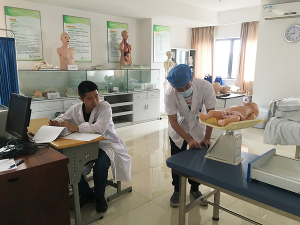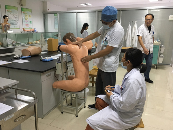 在技能室里,技能大赛如期举行,来自徐州医科大学、南通大学及长沙医学院临床专业实习医师共42人参加比赛。来自内、外、妇、儿各教研室的7位专家老师担任评委。