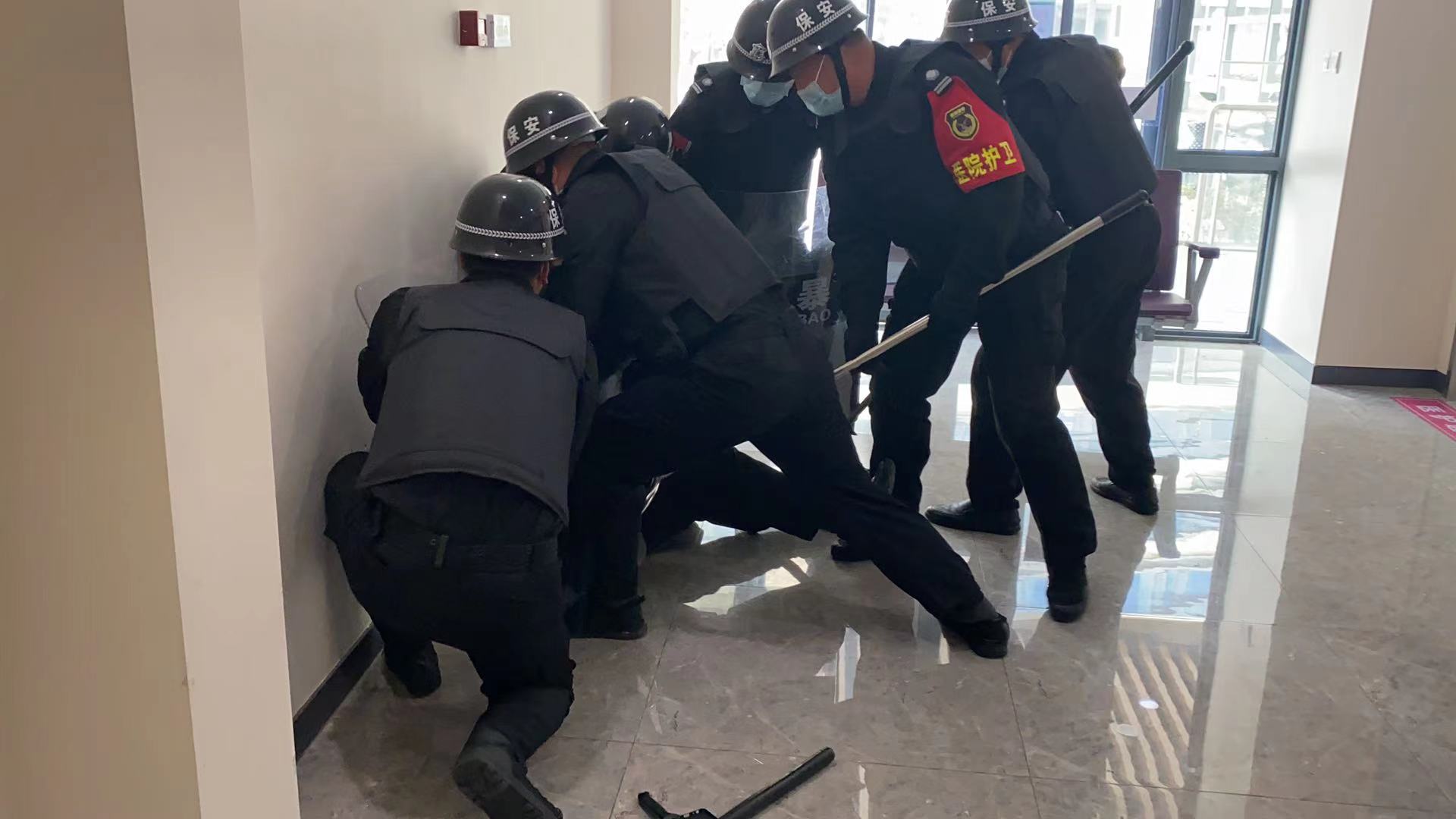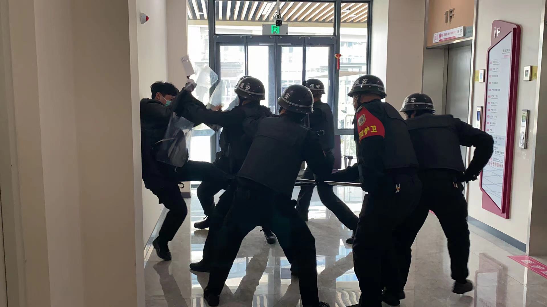 演练中,一名男子来到妇幼保健楼收费处,突然拿出包里的刀要挟工作人员交出钱款。工作人员面对突发情况沉着应对,表面详装为“歹徒”准备钱款,实则偷偷按下办公台的一键报警按钮。监控室人员收到一键报警信号,立即通知附近保安前去查看情况。附近保安抵达现场后,发现“歹徒”的意图,利用通讯设备简要讲明事件内容及地点,请求增援,并与“歹徒”保持安全距离进行周旋,通过交谈分散其注意力为救援行动拖延时间。在此期间,安保人员到位后,形成2队分别从侧门及大门进入展开救援行动。“歹徒”看到前来支援的保安队,企图逃跑,保安人员通过警棍、盾牌、防暴叉等装配及配合日常训练的防恐格斗技能,将“歹徒”成功制服,警报解除。