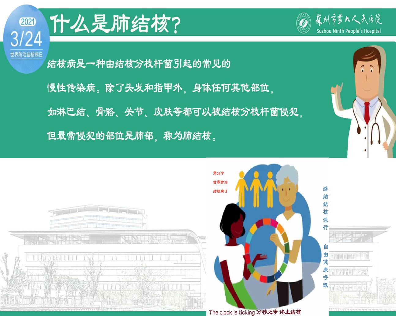2021年3月24日是第26个世界防治结核病日,今年世界卫生组织的宣传主题是:The clock is ticking(分秒必争,终止结核),我国的宣传主题是:终结结核流行,自由健康呼吸。今年主题的寓意是加快步伐消除结核病的社会危害是全民共同的责任和担当,只有分秒必争、奋蹄疾飞,才能早日实现终止结核病的流行,享受清新自在的呼吸和健康快乐的人生。