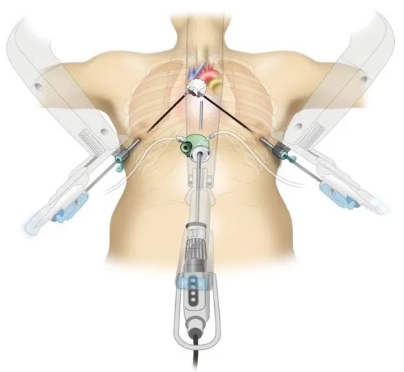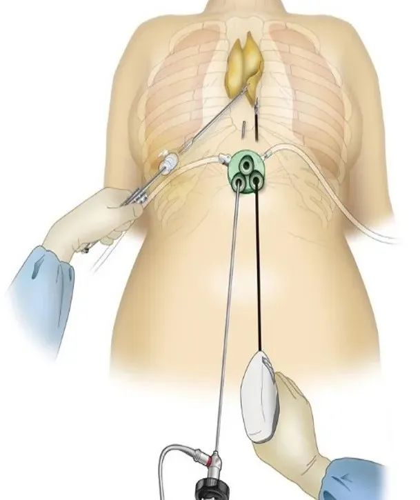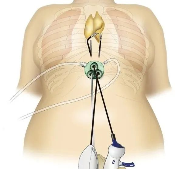 1手术操作范围更加开阔,可以将胸腺上极及两侧脂肪组织完整切除,同时能够准确保护重要神经,能够到达传统手术解剖的禁区。