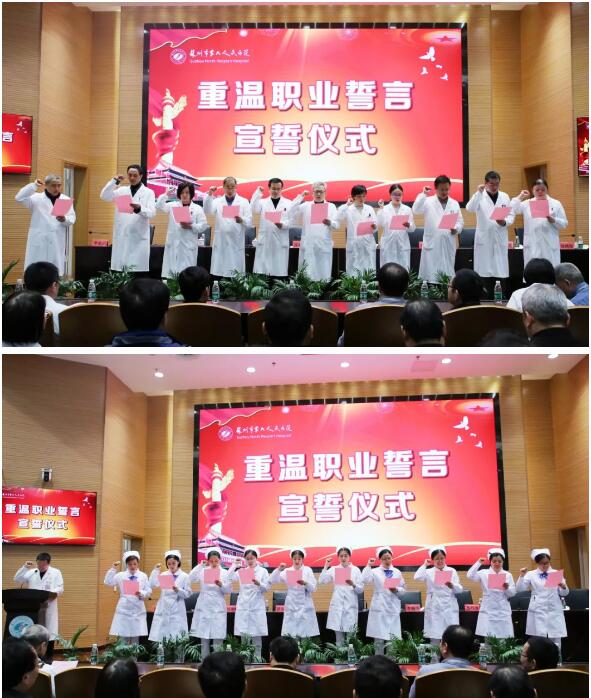 随后,希波克拉底誓言和南丁格尔誓言在会场相继响起,医生代表和护士代表分别肃然起立,重温职业誓言,重塑职业自信、行为自律,使“修医德、正行风”更加入脑入心。