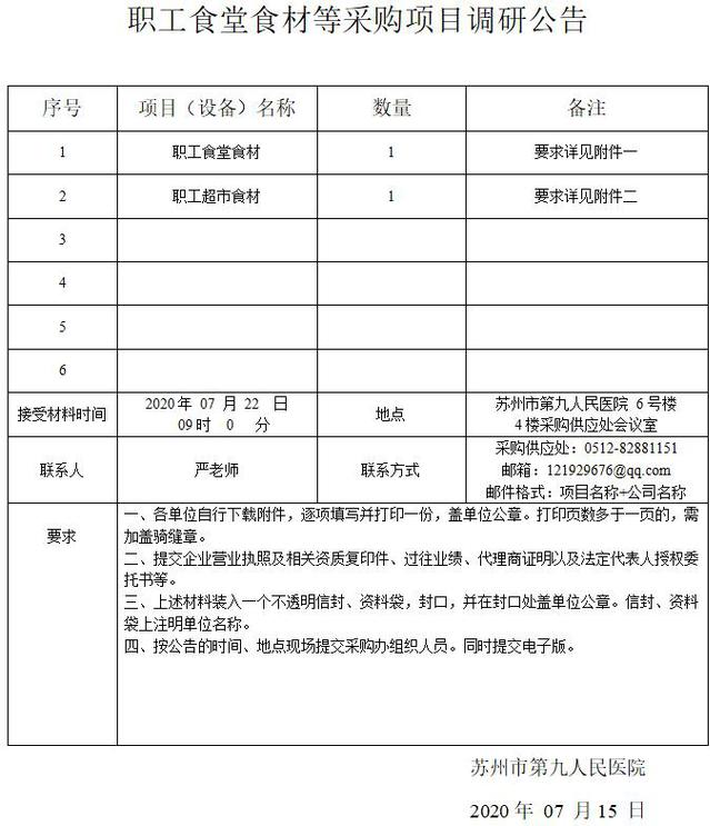 职工食堂食材等采购项目调研公告