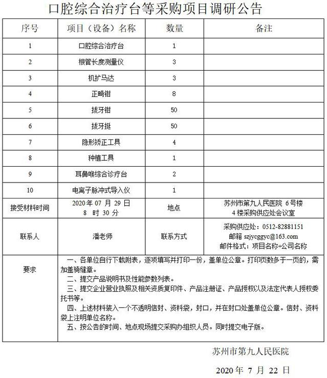 口腔综合治疗台等采购项目调研公告