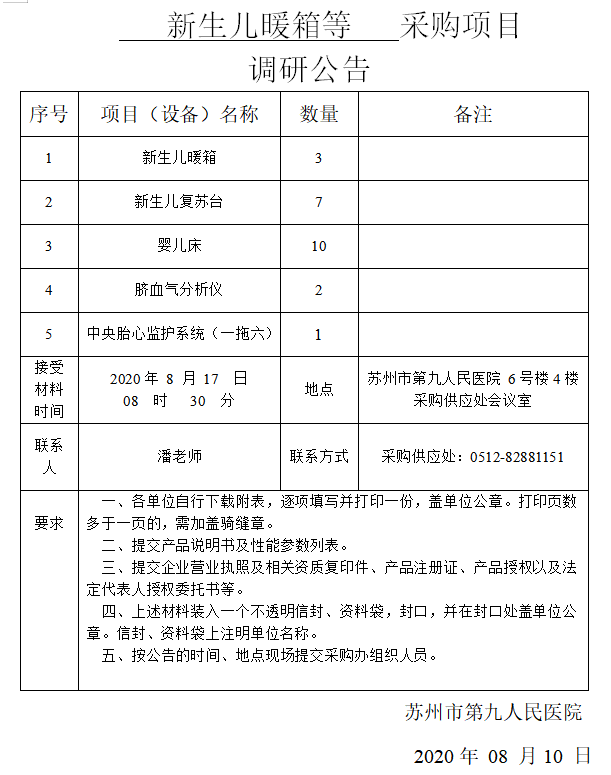 新生儿暖箱等采购项目调研公告