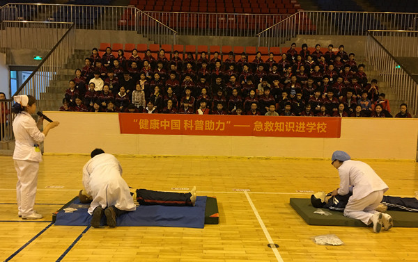4月26日,我院“急救危重症”团队一行8人在医务处副主任周兴根、护理部副主任刘永琴的带队下,来到吴江区实验初级中学开展急救知识培训。学校安排了宽敞明亮的体育场作为培训场地,我们将心肺复苏模型等讲课设备统一布置完毕。两位专科护士在人体模型上示范急救的分解动作,另一位专科护士进行同步讲解,同学们听得认真,看得仔细,老师们示范到位。心肺复苏术如今已被大众所熟知,但要做到正确有效的操作却并不容易,除了手法的到位,还有频率的把控,动作失之毫厘,急救效果却会差之千里。