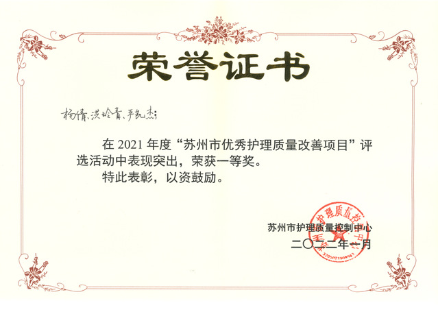 在苏州市优秀护理质量改善项目评比活动中获一等奖