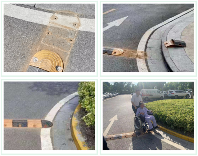 文明城市工作小组发现感染科大楼前停车场的减速带对腿脚不便坐着轮椅的患者及其家属造成了出行不便的影响。