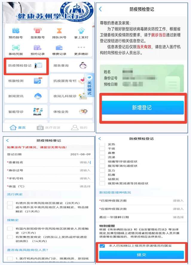 1.市民可在就诊当日通过健康苏州掌上行APP、苏州卫生12320 公众号亚洲色吧菜单“新冠专栏”,点击“防疫预检登记”。选择就诊人后,登记防疫预检信息。也可通过苏州卫生 12320公众号亚洲色吧菜单“预约挂号”栏选择“我要预约挂号”,在 弹出的提示框中点击“立即登记”,选择就诊人后,登记防疫预检信息。