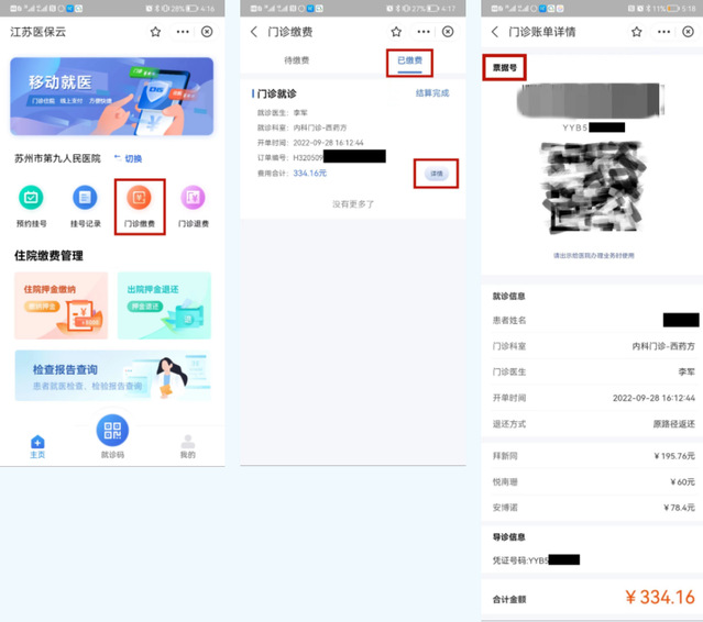 点击“移动就医”主页 “门诊缴费”模块-进入“已缴费”列表,查看缴费详情,可见电子缴费凭证,患者可在取药或检查治疗时出示。