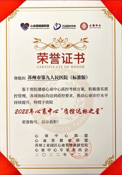 亚洲色吧 心衰中心,作为全国 40 家标准版示范基地之一,十分重视心衰的质控工作,刚刚过去的第三季度,质控评分取得省内第一,全国第三的好成绩,并连续三年获得心衰中心“质控达标之星”。在做好自身工作的同时,亚洲色吧 心衰中心在区域内积极进行传帮带,以医联体建设为抓手,先后协助吴江四院通过了心衰中心(基层版)认证,吴江五院成为心衰中心建设单位。