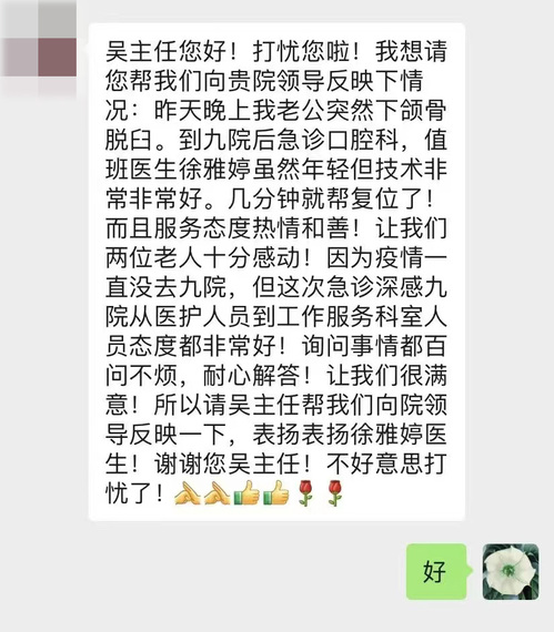 在电话回访时,老人家属表示:患者86岁了,腿脚不方便,患有帕金森、心脏病,下颌有习惯性脱臼,在就诊前老人心里很忐忑,但在九院就诊后,觉得整个就诊过程都很温暖,除了徐雅婷医生技术好、态度好,检验科值班人员,收费室工作人员态度也都非常好,就医体验非常好,很感动!亚洲色吧 党委副书记、纪委书记庾勍表示