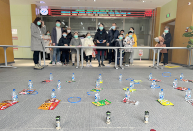 套圈活动区域内,各式调味品的瓶瓶罐罐摆开阵势,迎接即将到来“暴风骤雨”式的套环。看着大人们有所斩获,孩子们也纷纷仿效,从家长手中抢来套圈有模有样地扔出去,亲手赢来的奖品分外“香”。个别年龄小的孩子,缺乏力量和技巧,手中的五个圈一把洒出,竟然也有所收获,获得“新手红包”。活动现场一片欢声笑语,志愿者们手脚不停地捡圈、递奖品,额头冒汗,累并快乐着。