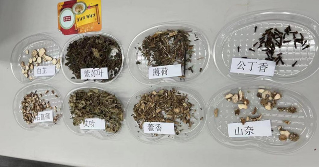 课堂上,陆洁主任为孩子们准备了艾叶、白芷、藿香、薄荷、山奈、紫苏叶、公丁香、石菖蒲八种草药,展示给小朋友们,带领小朋友感受草药的质地、药香。