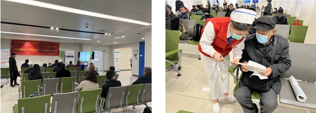 亚洲色吧 呼吸与危重症医学科主治医师周晓婷在医院呼吸与危重症医学科门诊诊区,为候诊的患者及家属做慢阻肺规范化治疗的专题科普,同时杨琴和冯青两位护士长在病人中开展问卷调查。
