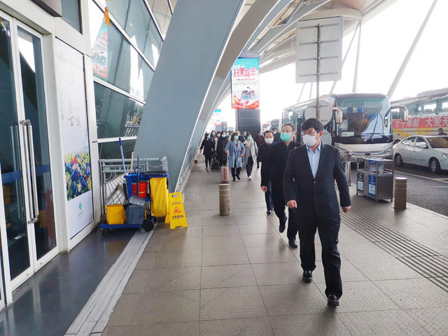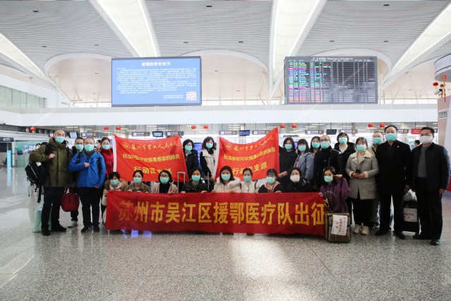 在无锡硕放机场,吴江区副区长汤卫明、区卫健委主任沈宇为“战士们”送行。