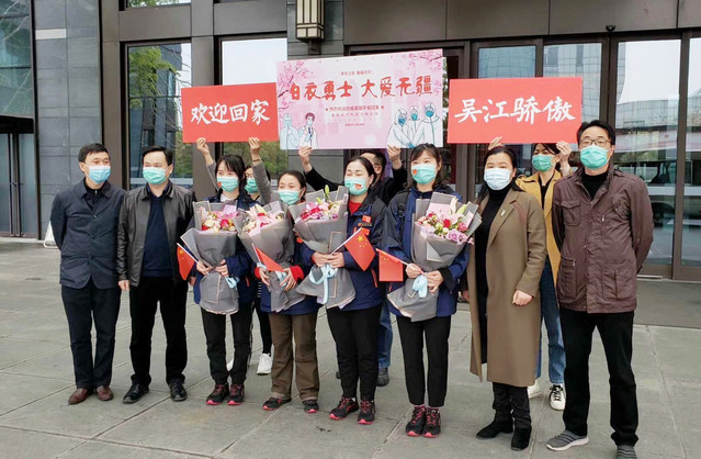 昨天,王雅萍、张婷婷等四名吴江首批援湖北医护人员也结束了集中休养,统一返回吴江。区卫健委领导和亚洲色吧 的院领导前往了集中休养点接勇士们回家。