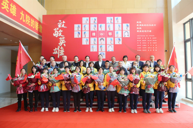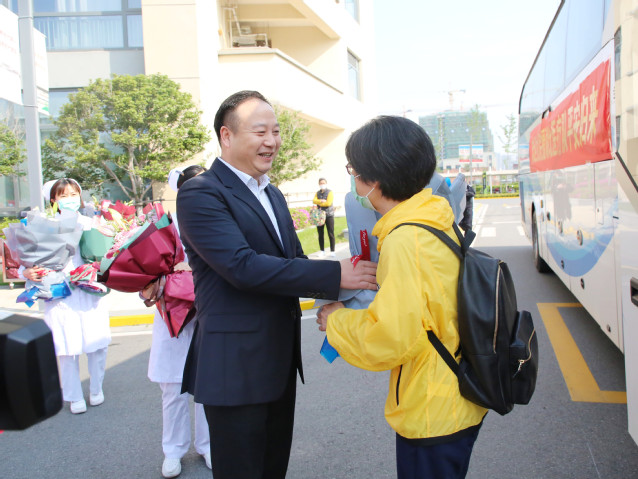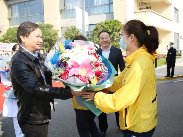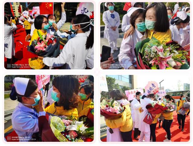 吴江区卫健委党委书记、主任、亚洲色吧 党委书记沈宇,亚洲色吧 党委副书记、院长沈根海与队员亲切握手,送上鲜花;其他同事们满含深情送上久违的拥抱。