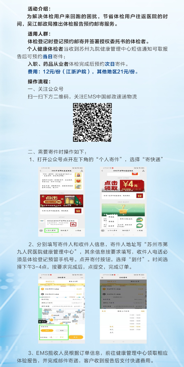 只要收到短信,提示可以来取报告,个人体检者就可以在EMS中国邮政速递物流公众号预约当日寄件。入职、药品从业者体检完成后可预约次日寄件。