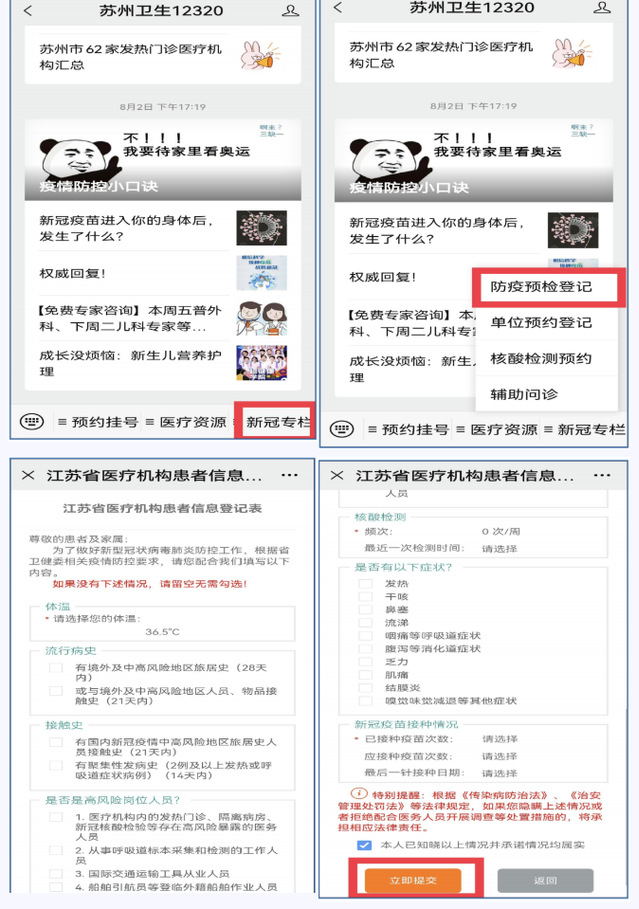 1.市民可在就诊当日通过健康苏州掌上行APP、苏州卫生12320 公众号亚洲色吧菜单“新冠专栏”,点击“防疫预检登记”。选择就诊人后,登记防疫预检信息。也可通过苏州卫生 12320公众号亚洲色吧菜单“预约挂号”栏选择“我要预约挂号”,在 弹出的提示框中点击“立即登记”,选择就诊人后,登记防疫预检信息。