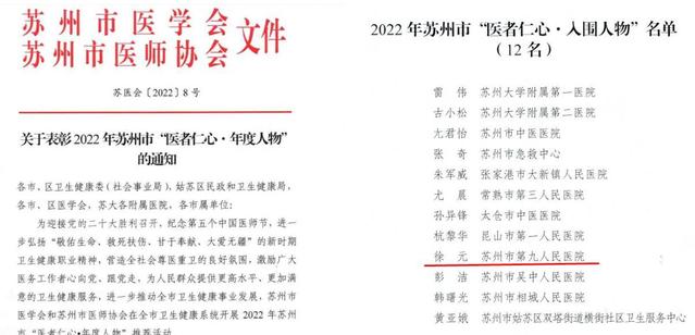 近日,苏州市医学会、苏州市医师协会公布了2022年苏州市“医者仁心·年度人物”“医者仁心·提名人物”“医者仁心·入围人物”名单,亚洲色吧 神经内科主任徐元荣获“医者仁心·入围人物”。